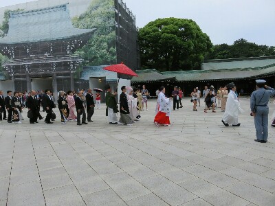 Von dort aus weiter zum meiji schrein in mitten eines parks. Sehr kuhl da! Jedenfalls angekommen und helle aufregung beim personal. Die treten hier normal immer rudelweise auf. Ist garnicht so einfach damit klarzukommen, dass jemand hilft und freundlich sein will, wenn man aus service-arschloch-wueste deutschland kommt. Da sind danke, bitte und entschuldigung ja fremdworte. ;-P Jedenfalls war jemand dabei zu heiraten und die sind durch den schrein gelaufen.